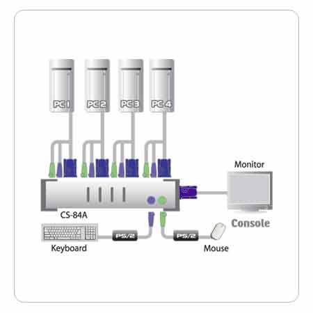 CS84A 為前後端內建PS/2介面的KVM切換器,提供一組控制端管控4台伺服器電腦主機,使用者可藉由前面板上切換按鍵,或是透過鍵盤上的熱鍵組合選擇切換。這是單一控制端管理多電腦,最簡便的解決方案。