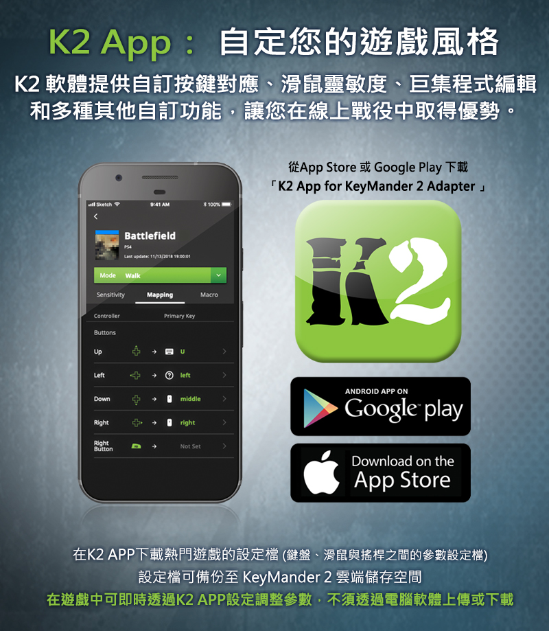 ◆免費下載直覺式K2 APP,40款以上遊戲設定檔,可即時設定參數