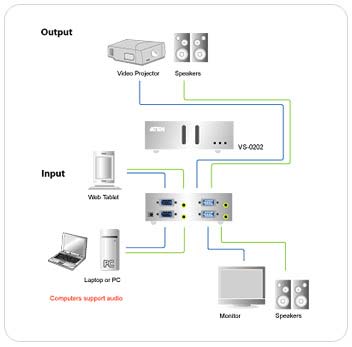 VS0202視訊切換器,允許使用者將2組電腦的視訊與音訊傳送至2組顯示器/投影機及擴音設備上,十分適合簡報及需將多組電腦資訊傳遞至多組終端顯示設備之應用環境。