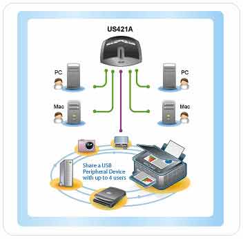 US421A 可讓4台電腦於one-at-a-time的基礎下,分享1個USB周邊設備,並可使用簡單熱鍵、前板上的按鈕、自動切換功能或是Windows應用程式控制軟體,就可切換可控制周邊裝置的電腦主機。此十分適合於現今的SOHO環境。