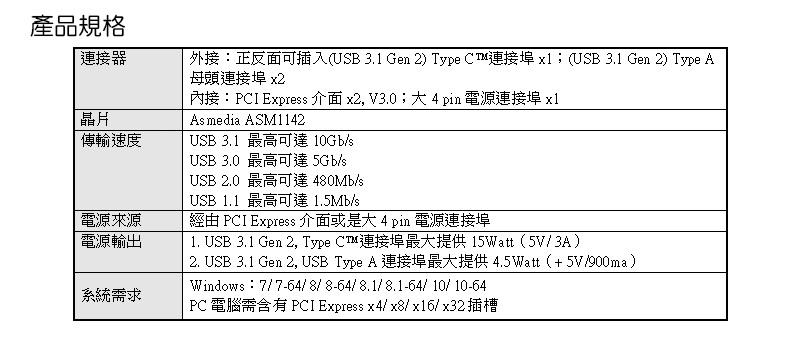 目前位置 :電腦組件 > >卡類 > >PCI-e卡 > >USB3.1