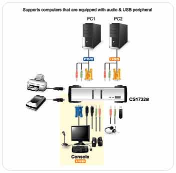 CS1732B是內建2埠USB 2.0 Hub的2埠KVMP?多電腦切換器,使用者可透過一組鍵盤、螢幕及滑鼠所組成的控制端,集中管理2台電腦。使用者亦可透過前板按鈕、熱鍵、OSD及滑鼠四種方式輕鬆進行電腦切換。