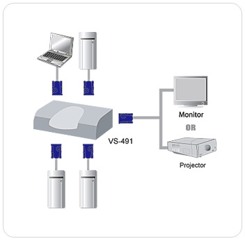 VS491為4埠的視訊控制裝置,可允許4台獨立的電腦主機,將其視訊輸出顯示於單一的顯示器,因此使用者無需再額外為每台電腦主機購買顯示器。
