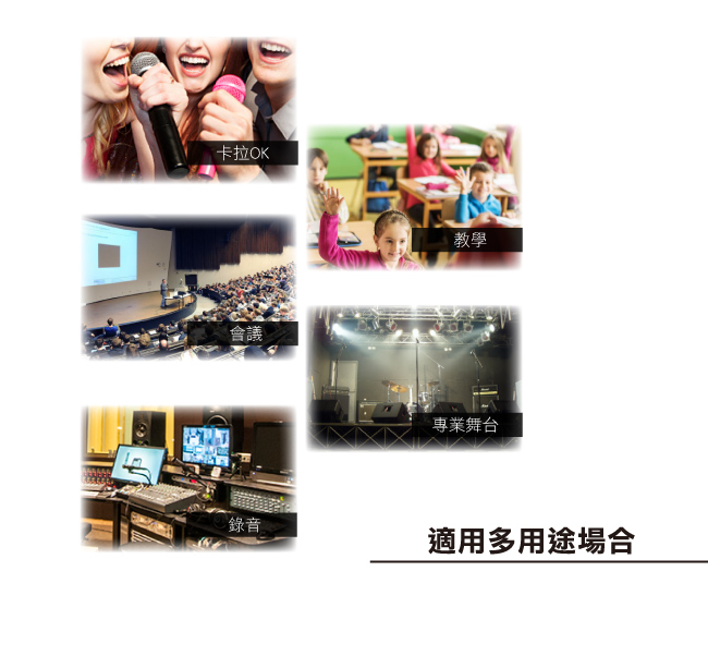 適用家用卡拉OK、舞台用、專業廣播、錄音、會議、教學等場合